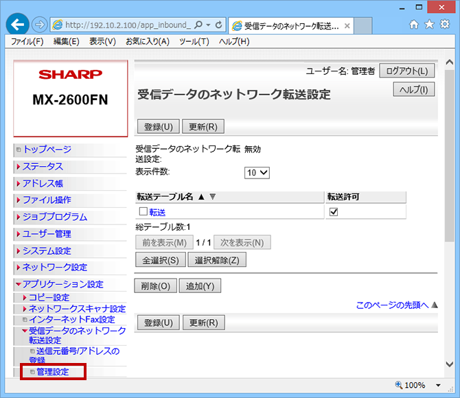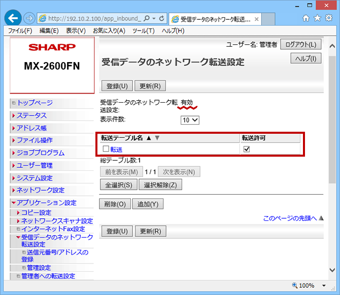 ④ 「管理設定」画面が表示されますので、受信データの転送で[有効]を選択し、[登録]ボタンを押してください。
