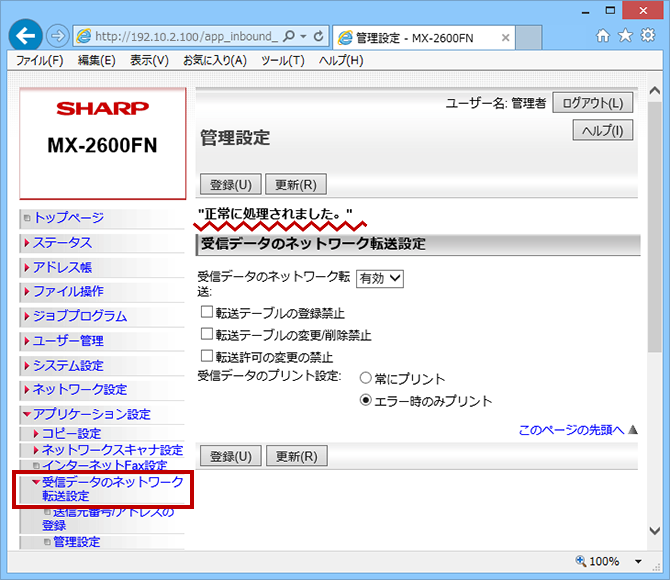 ⑤ "正常に処理されました。"と表示されましたら、メニューの[受信データのネットワーク転送設定]を押してください。