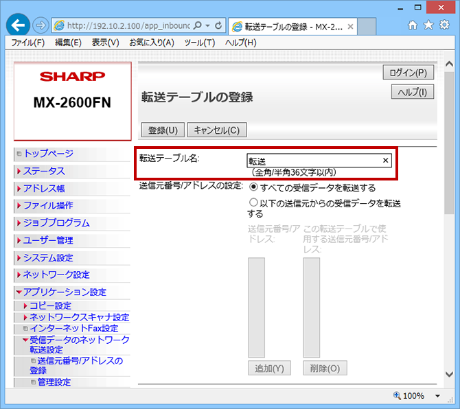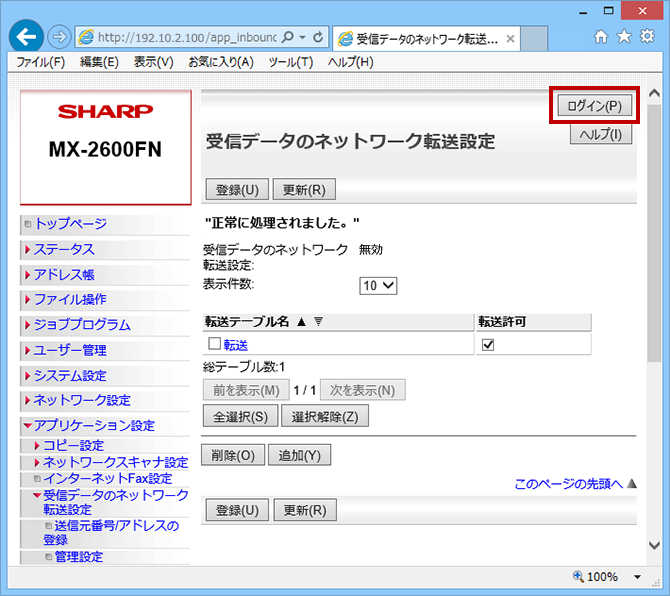 ※ 転送設定を「有効」にするには、管理者パスワードを入力してログインする必要があります。