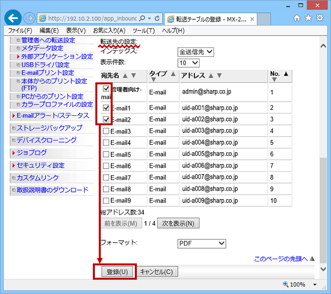 転送したい全ての宛先にチェックが入ったら[登録]ボタンを押してください。