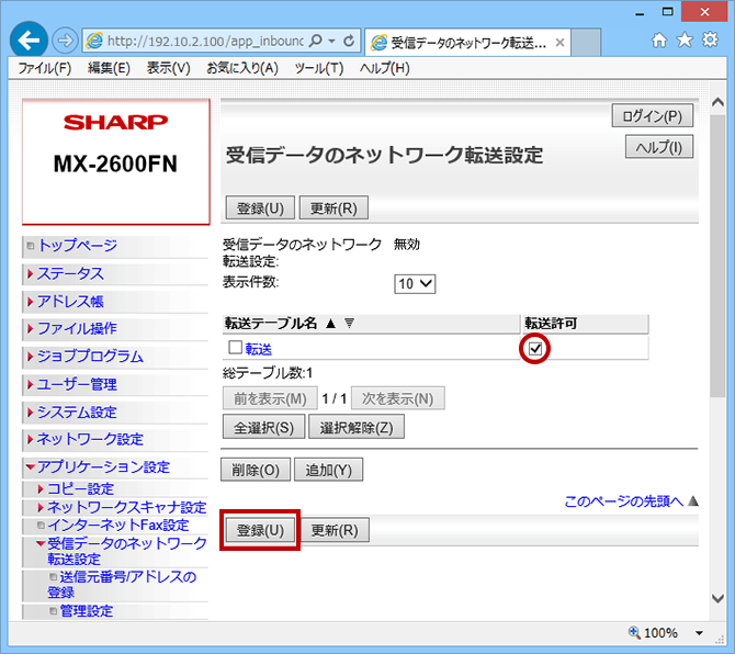⑥ 「受信データのネットワーク転送設定」画面が表示されますので、転送許可にチェックを入れ、[登録]ボタンを押してください。