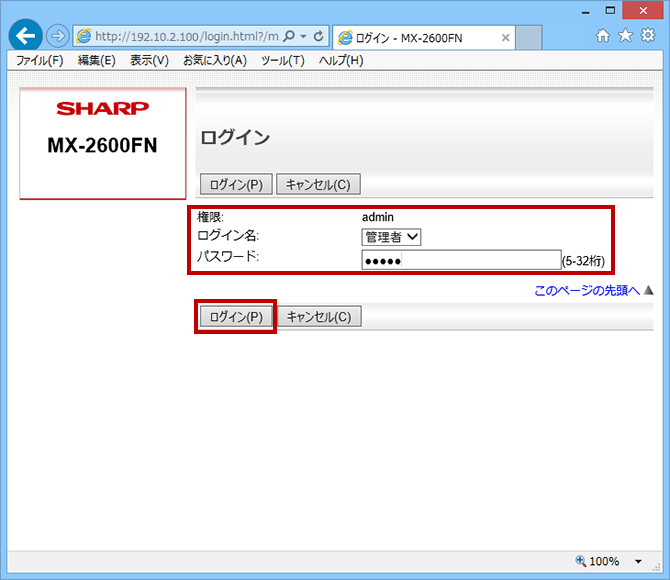 ② 管理者パスワードを入力し、[ログイン]ボタンを押してください。