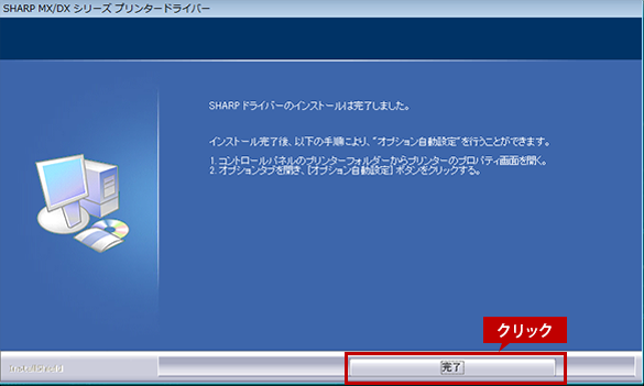インストールの完了画面が表示されたら、[完了]ボタンをクリックしてください。