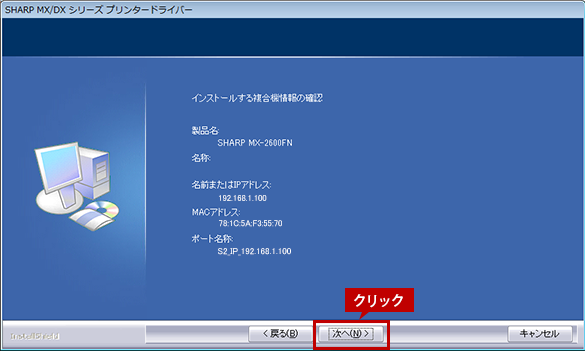 インストールする複合機を確認し、[次へ]ボタンをクリックします。
