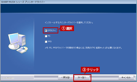 インストールするプリンタードライバーを選択し、[次へ]ボタンをクリックします。