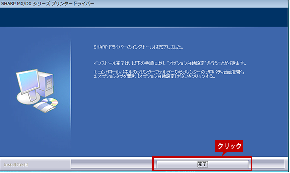 インストールの完了画面が表示されたら、[完了]ボタンをクリックしてください。