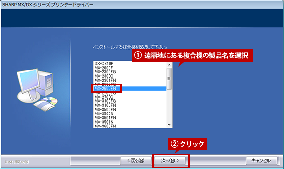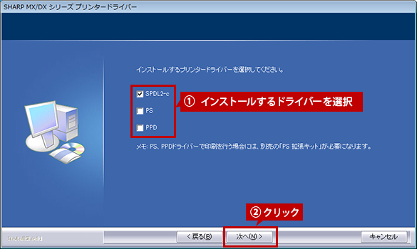 インストールするプリンタードライバーを選択し、[次へ]ボタンをクリックします。