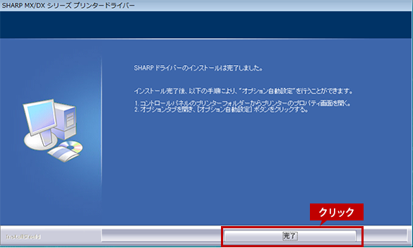 インストールの完了画面が表示されたら、[完了]ボタンをクリックしてください。