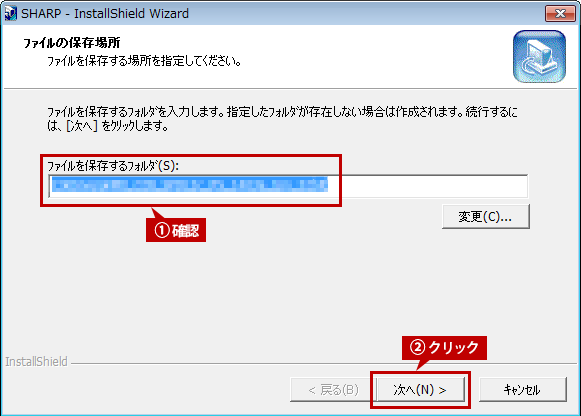 ファイルの保存場所を確認し、[次へ]ボタンをクリックします。