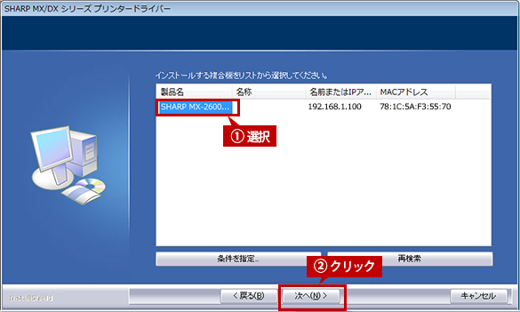検索された複合機からインストールする複合機を選択し、[次へ]ボタンをクリックします。