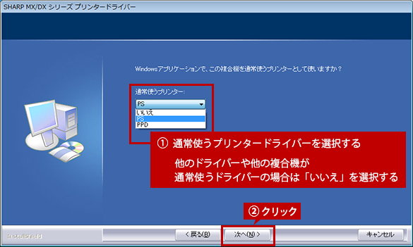 当複合機が通常使うプリンターの場合は、初期設定となるプリンタードライバーを選択します。