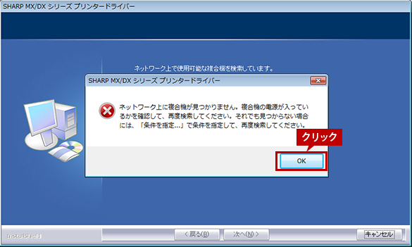 「ネットワーク上に複合機が見つかりません。(以下、省略)」のメッセージウィンドウにある[OK]ボタンをクリックします。