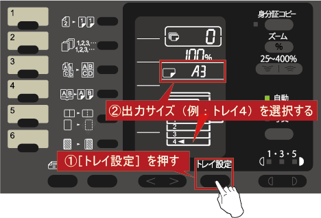 ⑤「トレイ設定」を押して、出力サイズ(例:トレイ4)を選択してください。