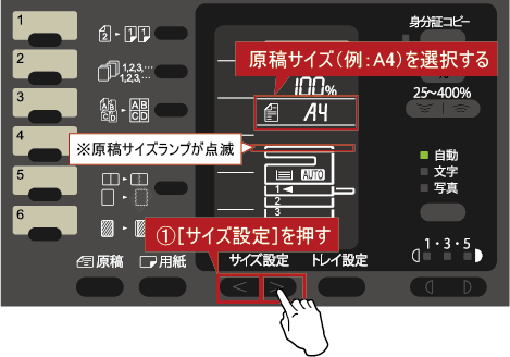③次に、[サイズ設定]を押して、原稿サイズ(例:A4)を選択してください。