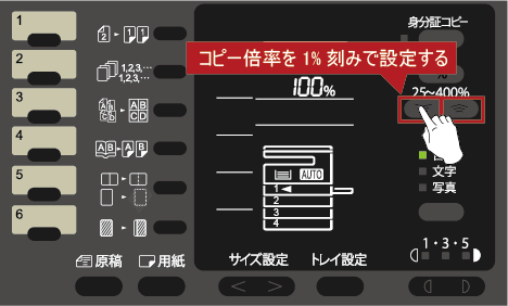 原稿サイズと用紙サイズが決まっている場合、最適な倍率を本体操作で選ぶことができます。また、用紙より少し小さくコピーするなどの微調整も可能です。