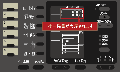 トナー残量(例:100%)が表示されます。