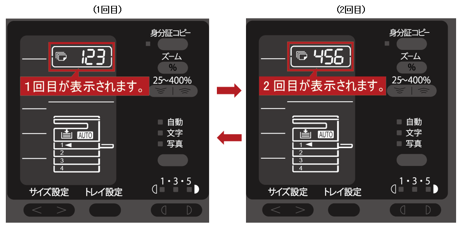 ※「0」を押し続けると「1回目→2回目→1回目・・・」と繰り返し表示されます。