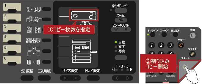 ④コピー枚数などを設定後、[スタート]を押して割り込みコピーを開始してください。