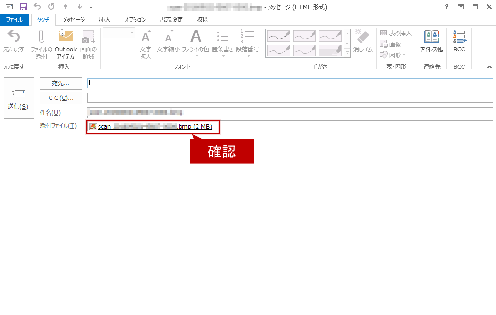 ⑤スキャン送信が終わりましたら、お使いのメーラー(例:Outlook2013)が起動されますので、スキャン文書が添付されていることを確認してください。