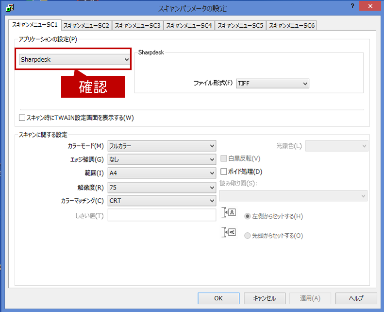 ※ここでは、操作パネルの「送信1」ボタンに-スキャンした文書をSharpdeskに取り込む-を割り当てた場合を記載しております。