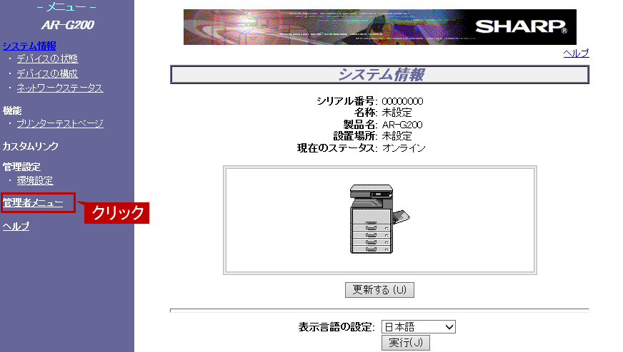 ①複合機に接続できましたら、メニューから[管理者メニュー]をクリックしてください。