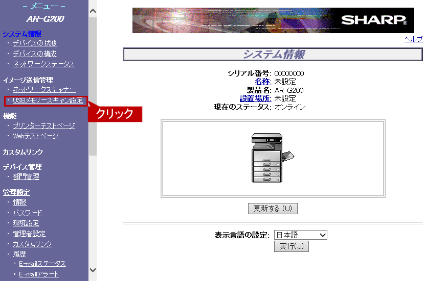 本機のWEBページに接続して、「USBメモリースキャン設定」で保存形式を変更することができます。