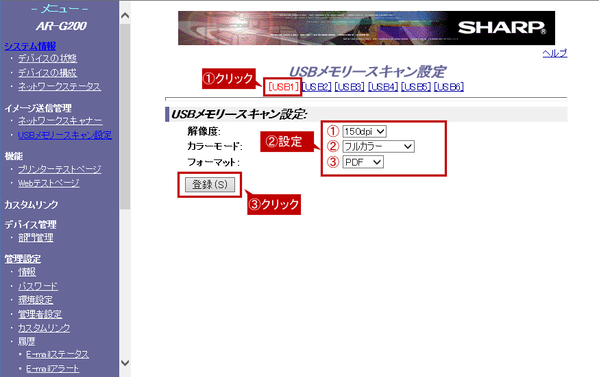 ④「USBメモリースキャン設定」画面が表示されますので、[メニュータブ(例:USB1)]を選択し、各項目を設定後、[登録(S)]をクリックしてください。