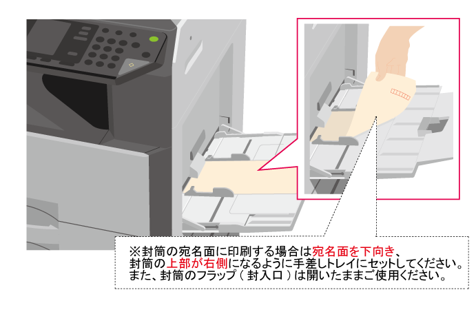 印刷する面を下向きにして、封筒の下端を複合機側に向けてセットします。