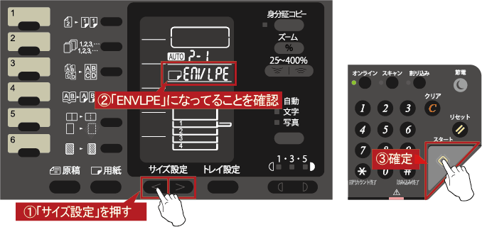 ④手差しディスプレイが点滅しますので、[サイズ設定]を押して「ENVLPE」を選択後、[スタート]を押して確定してください。
