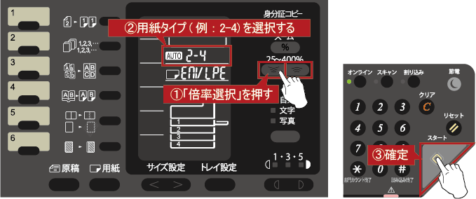 ⑤用紙サイズを確定しましたら、[倍率選択]を押して「用紙タイプ(例:2-4)」を選択後、[スタート]を押して確定してください。