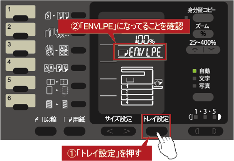 ⑦基本画面に戻りますので、[トレイ設定]を押して手差しトレイが「ENVLPE」になっていることを確認してください。