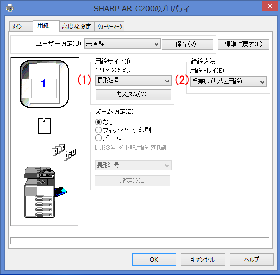 (2)「用紙トレイ(E):」:「手差し(カスタム用紙)」