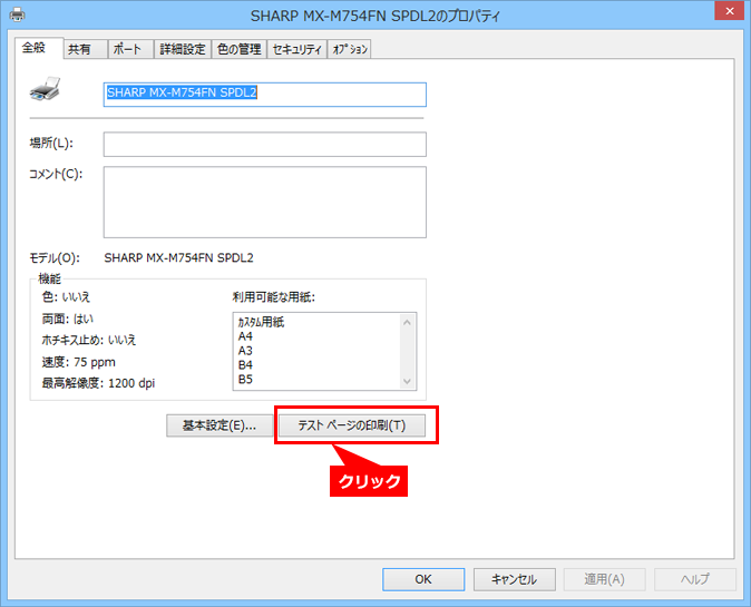 下図はMX-M754FNのSPDL2ドライバーのプロパティ画面です。