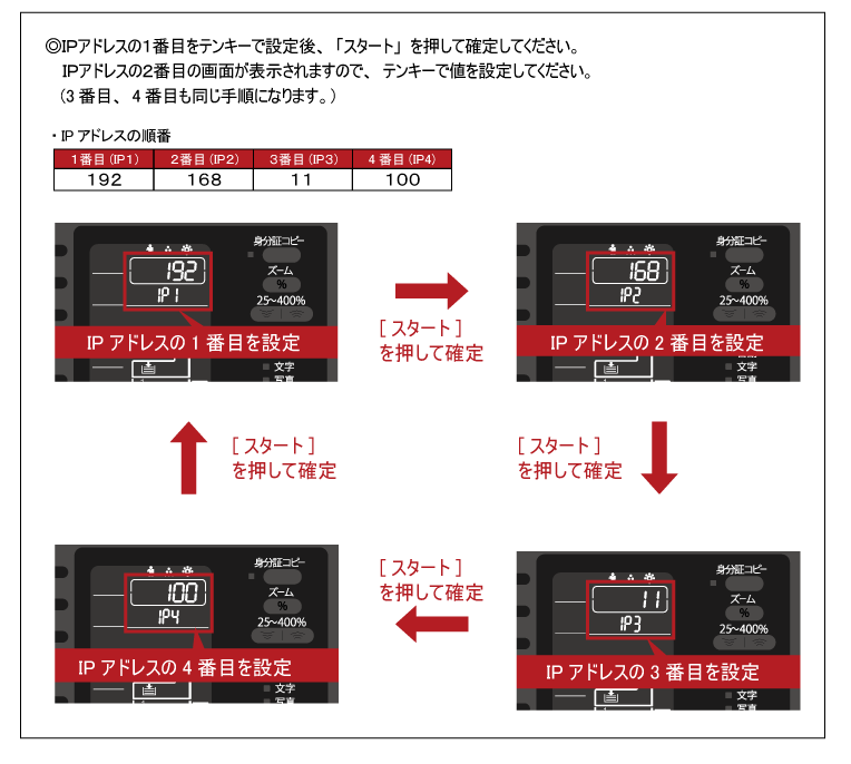 ⑨IPアドレスの1~4番目まで設定しましたら、[濃度設定]の左ボタンを押して、設定モードから抜けてください。