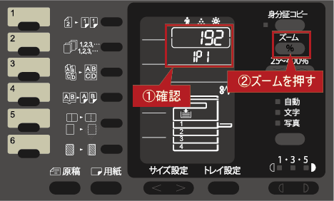 ④置数表示部にIPアドレスの1番目(例:192)が表示されますので、[ズーム]を押して自動取得(DHCP)の設定をしてください。
