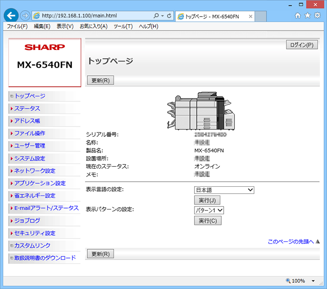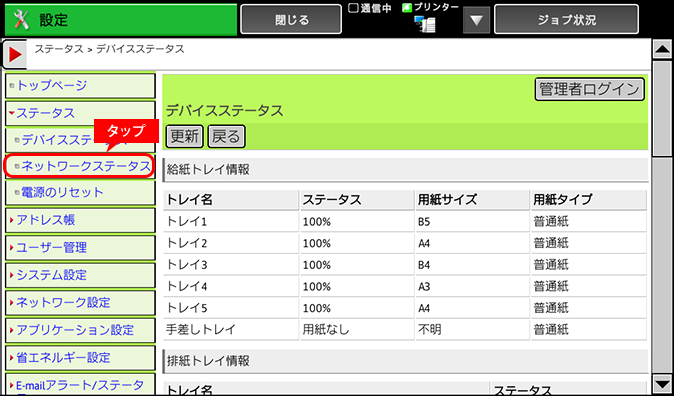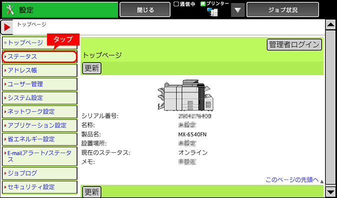 (表示されたWeb管理画面では、複合機の状態確認や設定・変更が可能です。)