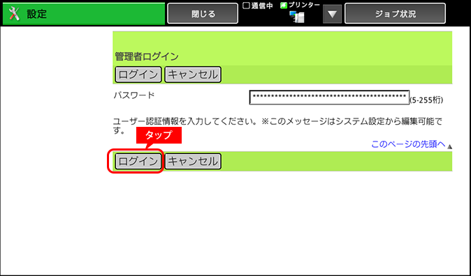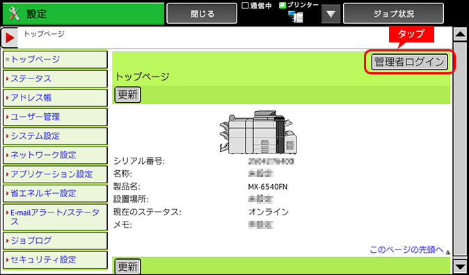 右上にある[管理者ログイン]をタップします。