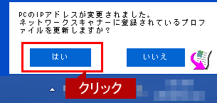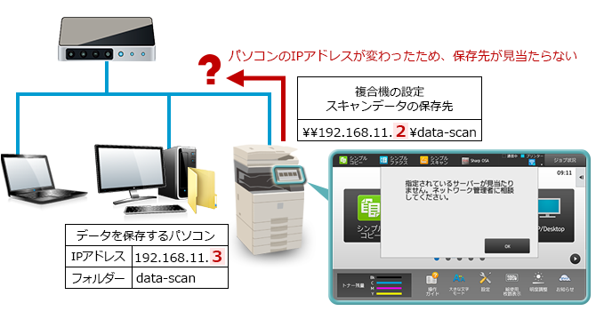 パソコンのIPアドレスを変更したら、複合機に設定している「スキャンデータの保存先」も変更する必要があります。ルーターを交換したり、DHCPでIPアドレスを自動配布していると、パソコンのIPアドレスが変更される場合があります。