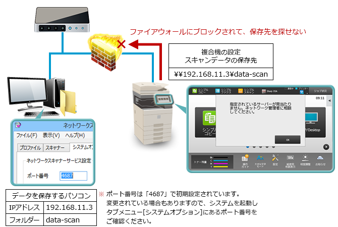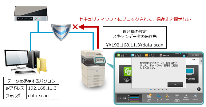 スキャンデータの保存先に設定しているパソコンを複合機から見つけられない時に、本内容のエラーメッセージが表示されます。