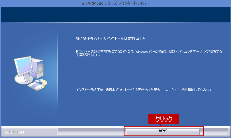 インストールの完了画面が表示されたら、[完了]ボタンをクリックしてください。