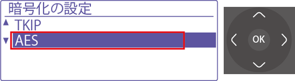 13. 「暗号化の設定」画面が表示されますので、[▲][▼]を押して暗号化方式を選択し、[OK]を押してください。