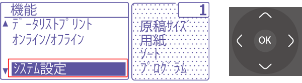 2. 「機能」画面が表示されますので、[▼]を押して[システム設定]を選択し、[OK]を押してください。