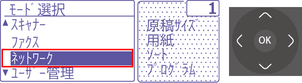 4. 「モード選択」画面が表示されますので、[▲][▼]を押して[ネットワーク]を選択し、[OK]を押してください。