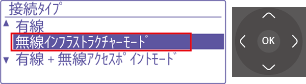 6. 「接続タイプ」画面が表示されますので、[▲][▼]を押して[無線インフラストラクチャーモード]を選択し、[OK]を押してください。