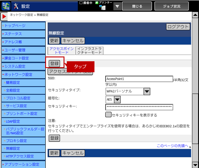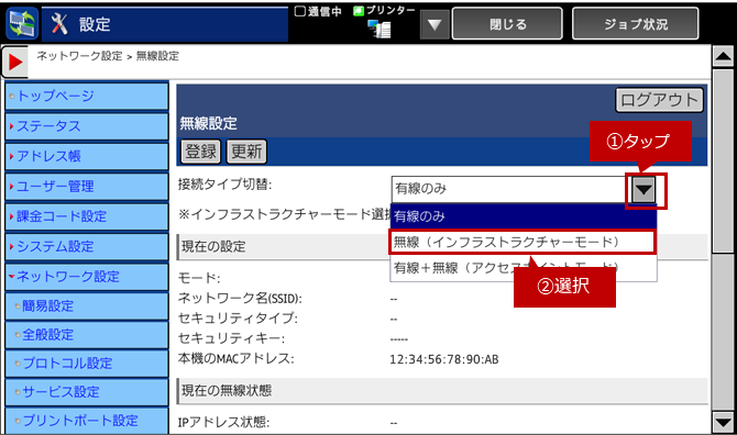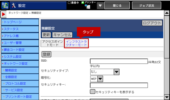 複合機の無線設定で「インフラストラクチャーモード」に設定します。