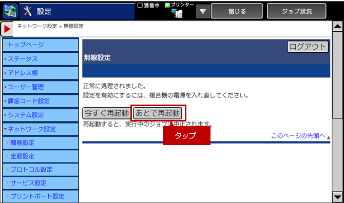 6.「正常に処理されました。~」の画面が表示されますので、[あとで再起動]をタップしてください。