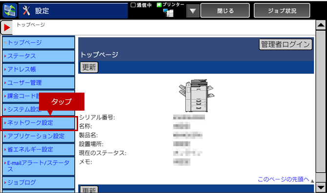 ログイン画面が表示されますので、管理者パスワードを入力しログインしてください。管理者ログインを実施するには、下記の参考情報を参照してください。