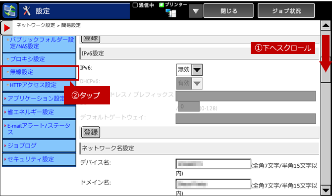 3.「簡易設定」画面が表示されますので、ページを下へスクロールして、[無線設定]をタップしてください。