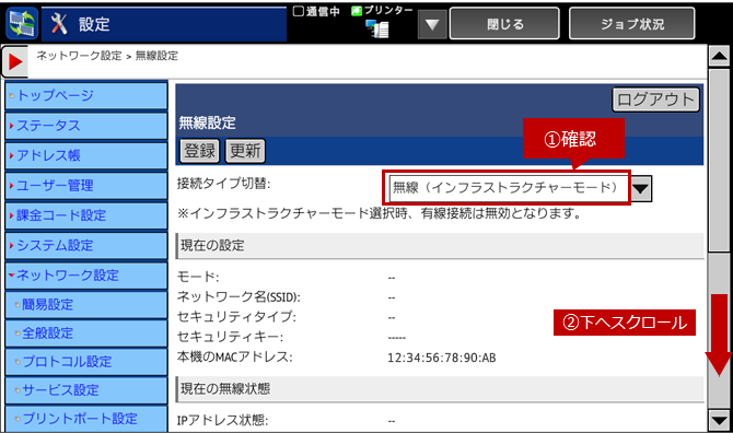 7.「無線設定」画面に戻りますので、「接続タイプ切替」が「無線(インフラストラクチャーモード)」になっていることを確認して、ページを下へスクロールしてください。