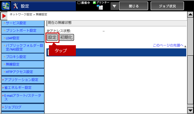 8.「現在の無線状態」の[設定]をタップしてください。